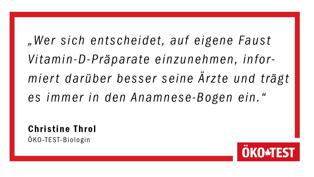 Auch bei den Deklarationen gibt es unserer Meinung nach Verbesserungspotential. So bemängeln wir bei allen Nahrungsergänzungsmitteln, dass sie Personengruppen, die ein höheres Risiko für eine unzureichende Vitamin-D-Bildung über die Haut haben, nur unvollständig oder gar nicht auf der Verpackung oder den Beipackzetteln aufführen.