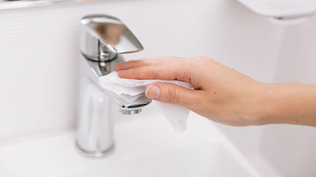 Tunken Sie ein sauberes Tuch in die Flüssigkeit und wischen damit gründlich über die Armaturen. Lassen Sie den Zitronensaft rund zehn Minuten einwirken und wischen noch einmal mit einem nassen Tuch darüber. Ihre Armaturen sollten nach der Zitronenbehandlung wieder schön glänzen.