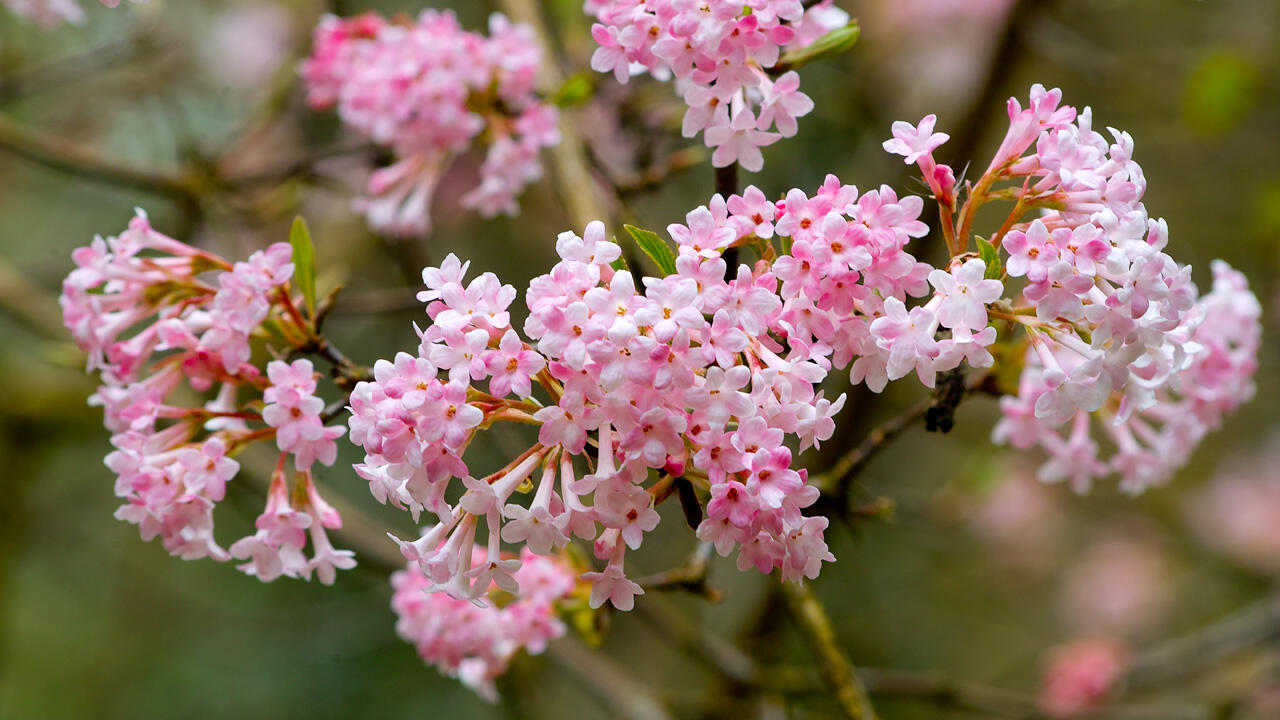 Der Winterschneeball mit seinen rosafarbenen Blüten, die kleine Kugeln bilden, blüht von November bis in den März hinein. Seine Blüten duften herrlich und intensiv. Er ist ein anspruchsloses Gehölz, das bis zu drei Meter hoch werden kann.