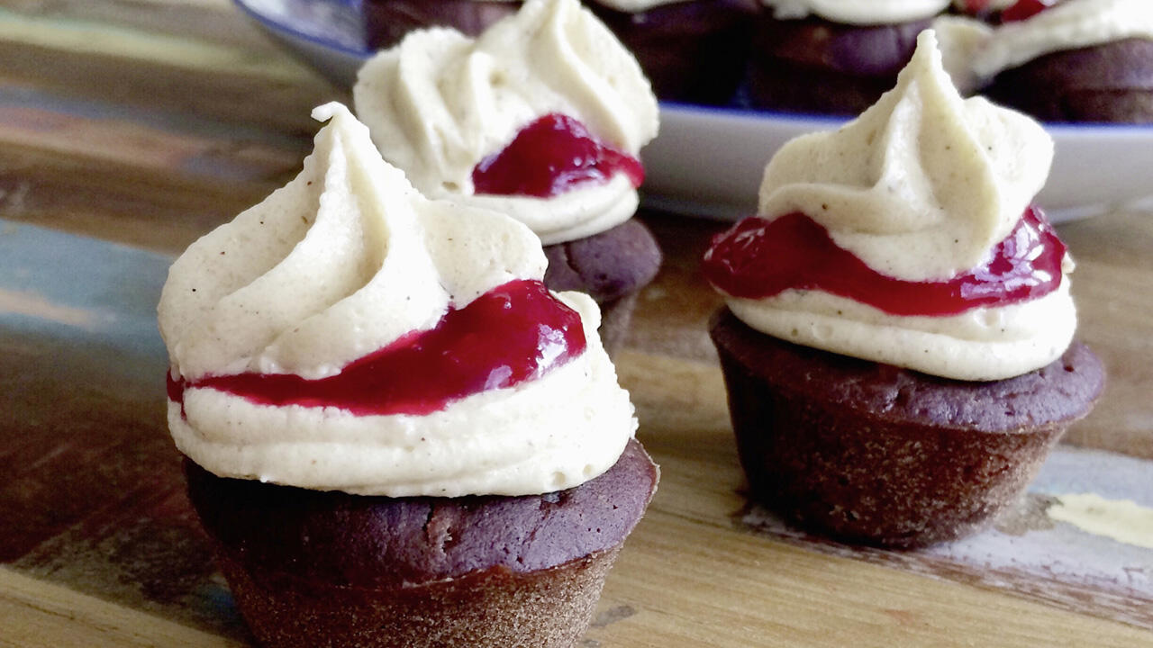 2. Die Creme in einen Spritzbeutel füllen. Auf jeden Muffin jeweils einen Kreis entlang der Rands spritzen. Etwas von der abgekühlten Preiselbeermasse in die entstandene Vertiefung auf den Muffin geben. Zum Schluss einen Tupfer des Frostings auf die Preiselbeersauce spritzen.