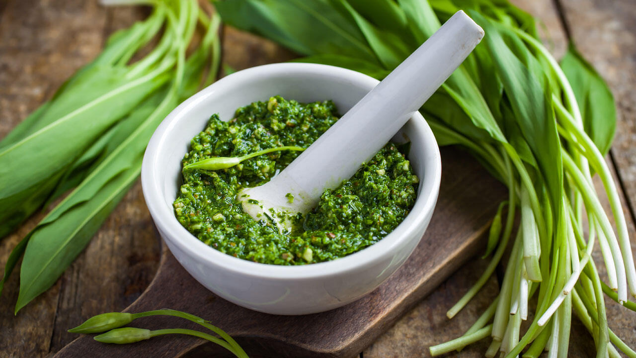 Bärlauch, Brennnesseln, Giersch und Löwenzahn eignen sich gut für ein kräftiges Pesto. Dafür 100 Gramm fein gehackte Kräuter mit 60 Gramm geriebenem Pecorino und 50 Gramm vorher in der Pfanne gerösteten und dann gemahlenen Pinienkernen vermischen. Je nach Vorliebe auch noch ein bis zwei fein gehackte bzw. gepresste Knoblauchzehen hinzugeben. Das Ganze mit Olivenöl gut verrühren, bis das Pesto cremig ist. Mit Salz abschmecken. Passt zu Nudeln aller Art und an die Salatsauce.