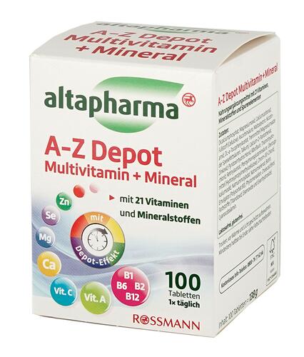 RossmannAltapharma A-Z Depot Multivitamin + Mineral, Tabletten KategorieMultivitaminpräparateTagesdosis1 TabletteAlle Produkte des Tests anzeigen