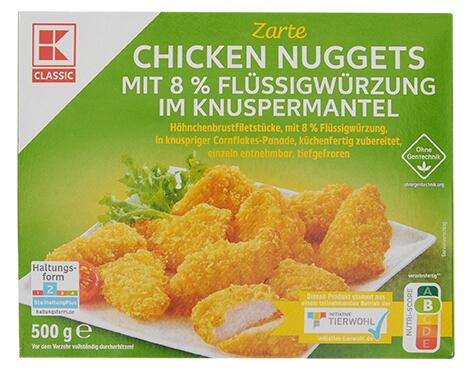 Kaufland (Plukon)K-Classic zarte Chicken Nuggets KategorieChicken NuggetsPreis pro 500 g / 9 Stück3,99 EuroAlle Produkte des Tests anzeigen